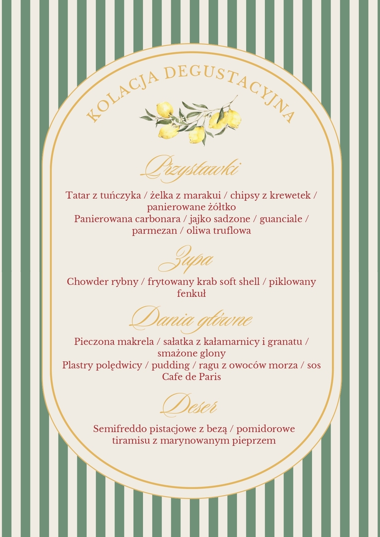 Łebunia Palace invites guests to exquisite tasting dinners created by the head chef. The menu includes five refined dishes, such as tuna tartare, fish chowder, and pistachio semifreddo. This exceptional culinary event combines luxurious flavors with the elegant atmosphere of the historic palace.
