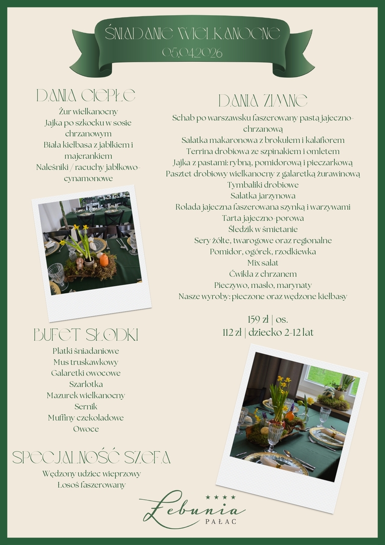 Pałac Łebunia zaprasza na uroczyste śniadanie wielkanocne, które odbędzie się 5 kwietnia 2026 roku. Oferta obejmuje bogaty bufet z tradycyjnymi potrawami i świątecznymi wypiekami w cenie 159 zł za osobę dorosłą, z przewidzianymi zniżkami dla dzieci. To doskonała okazja do celebrowania świąt w eleganckiej atmosferze zabytkowych wnętrz pałacu.